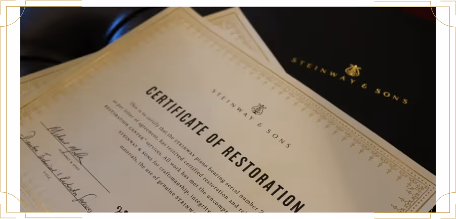 - Steinway & Sons Certificate of Restoration – Guaranteeing that the restoration work adheres to Steinway’s rigorous standards and uses genuine Steinway parts.